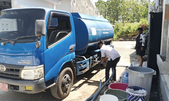 Untuk memenuhi kebutuhan warga, PDAM bergerak cepat dengan menyalurkan air bersih menggunakan mobil tangki ke lokasi.