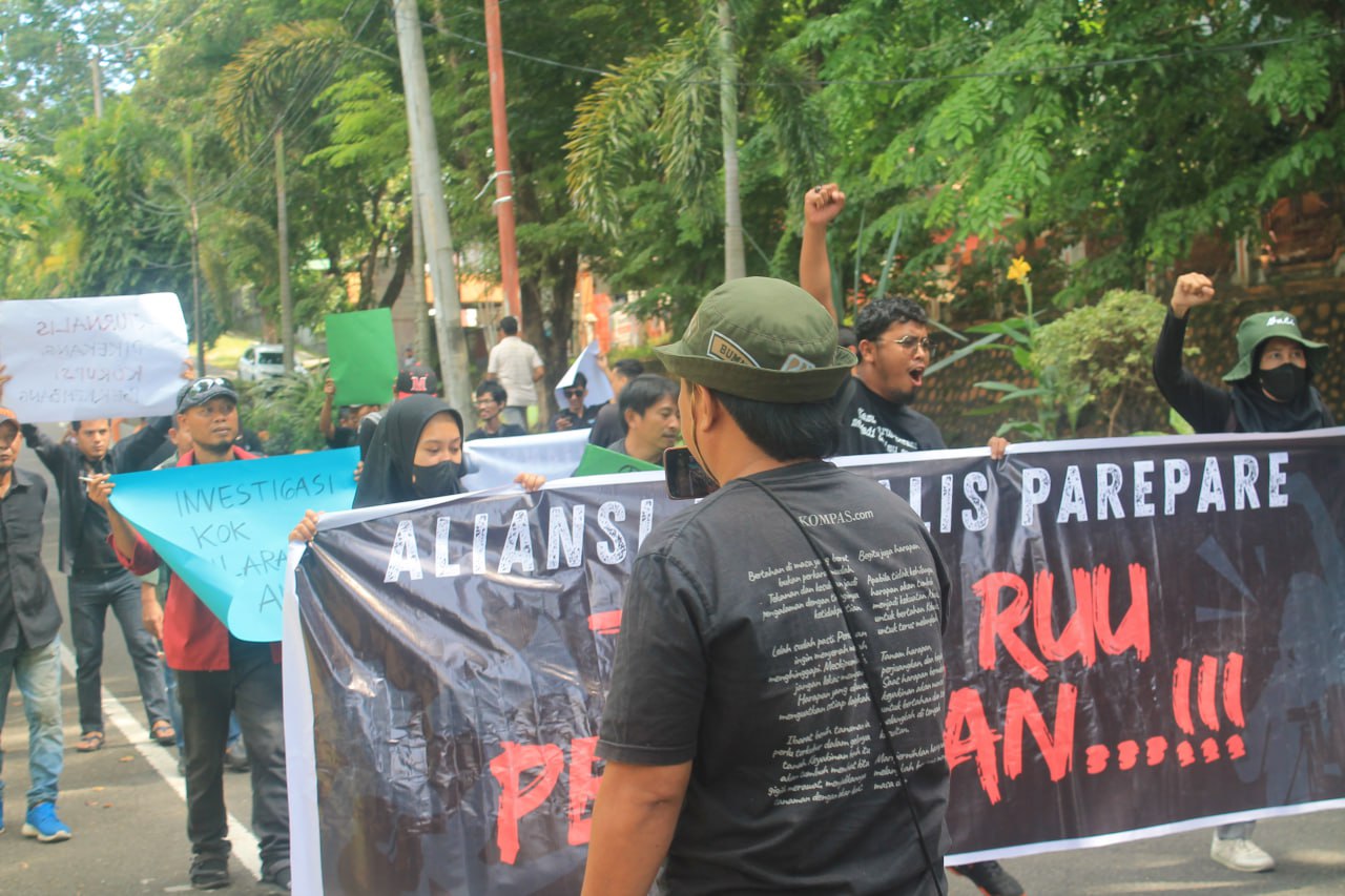 PAREPARE — Aliansi Jurnalis Parepare (AJP) menggelar aksi demonstrasi menolak Rancangan Undang-undang (RUU) Penyiaran didepan Kantor DPRD Kota Parepare, Kamis 30 Mei 2024.