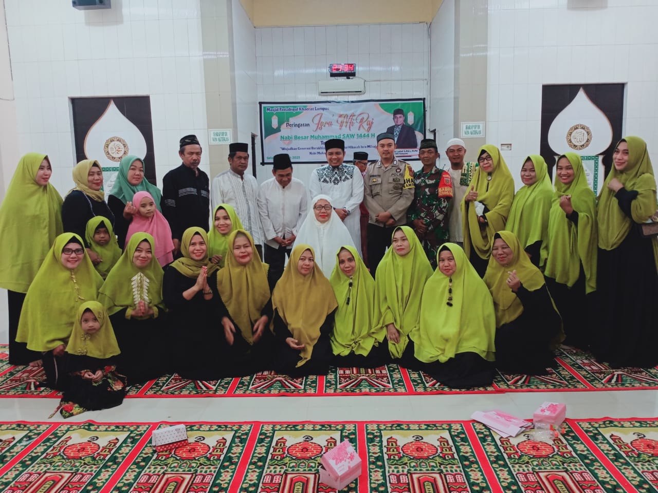 Peringatan Isra’ Mi’raj Nabi Muhammad SAW 1444 H juga turut dihadiri para tokoh masyarakat, para jemaah dan pengurus Masjid serta ibu-ibu Majelis ta’lim Fastabiqulkhairat.