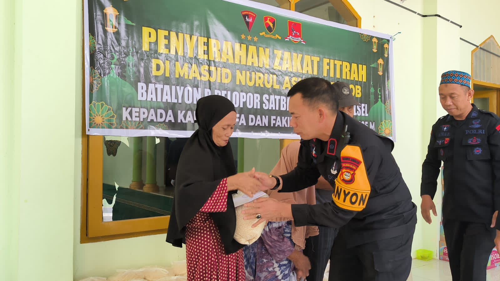 Komandan Batalyon B Pelopor Satuan Brimob Polda Sulsel, Kompol Ramli, S.Sos., S.M., M.Si., M.M., secara langsung menyerahkan zakat fitrah kepada masyarakat yang membutuhkan. Ia didampingi oleh ketua panitia zakat serta pengurus Masjid Nurul Askar Batalyon B Pelopor dalam proses penyaluran bantuan tersebut.