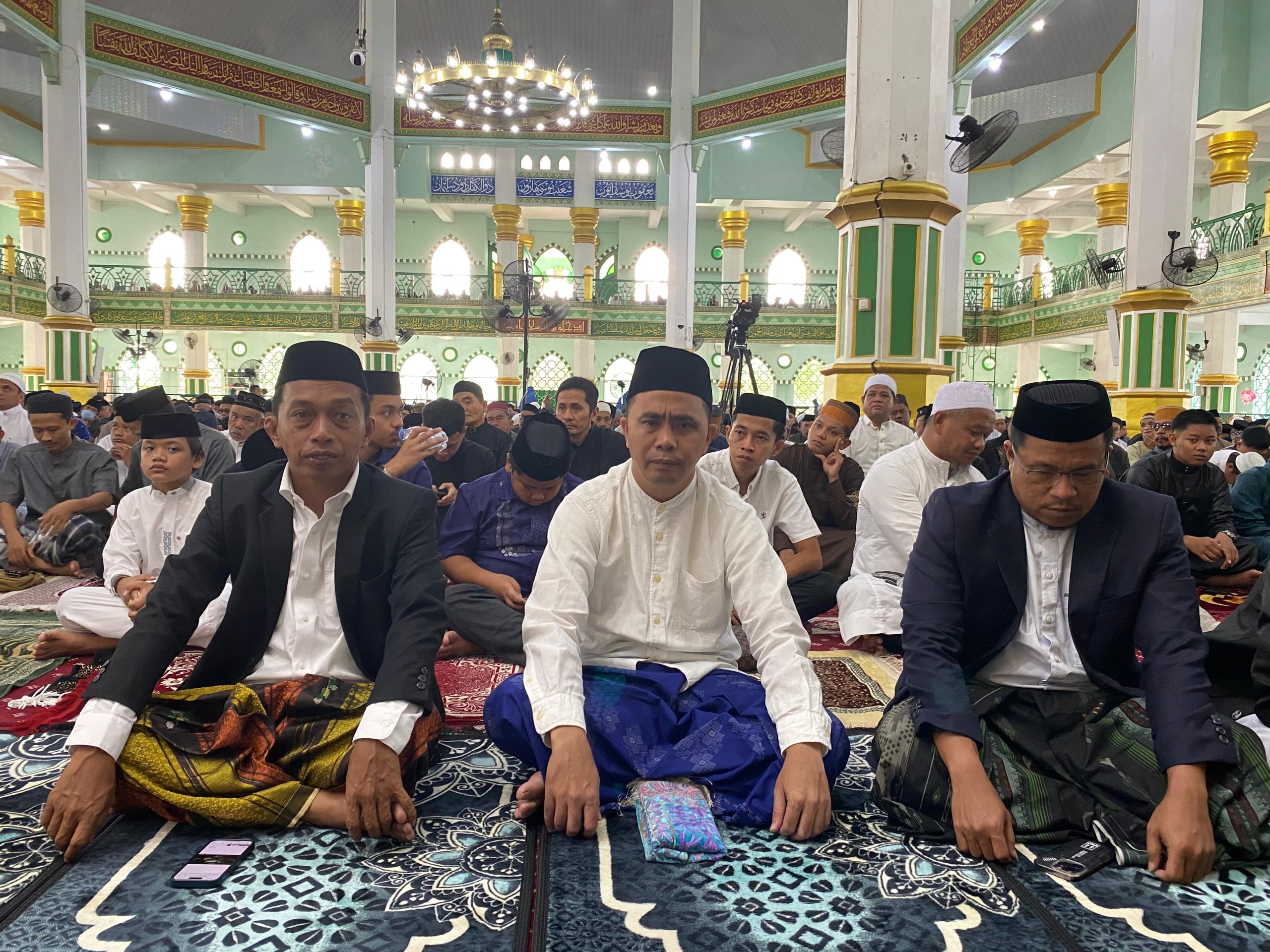 SIDRAP, VOICESULSEL — Bupati Sidenreng Rappang, H. Syaharuddin Alrif bersama Forkopimda melaksanakan salat Iduladha 1446 Hijriah di Masjid Agung Pangkajene, Jumat (6/6/2025).