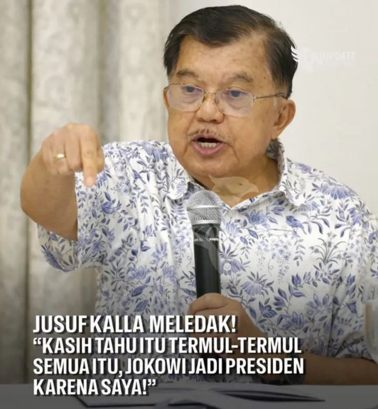 “Saya Wakilnya pak Jokowi, tapi sudah itu selesai, maka kita kembali sebagai warga biasa, saya lebih tua dari dia (Jokowi), jadi sebagai orang yang lebih senior saya nasehati. Banyak yang mengatakan apalagi pak JK itu, apa kurangnya pak Jokowi ke pak JK sehingga begini, apakah saya tuduh pak Jokowi, tidak, apakah saya melawan, juga tidak,” ujarnya.