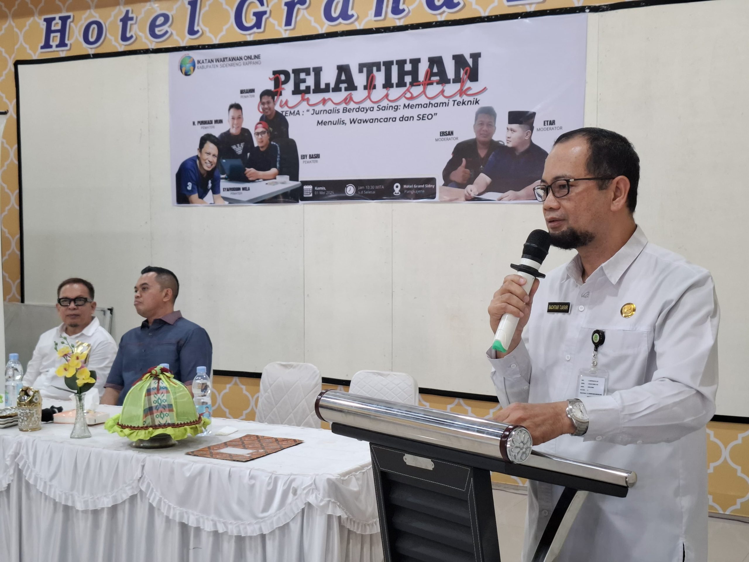 Pelatihan yang mengusung tema “Jurnalis Berdaya Saing, Memahami Teknik Menulis, Wawancara, dan SEO” ini berlangsung di Hotel Grand Sidny, dihadiri Kapolres Sidrap, AKBP Fantry Taherong, dan Ketua IWO Sidrap, Edy Basri.