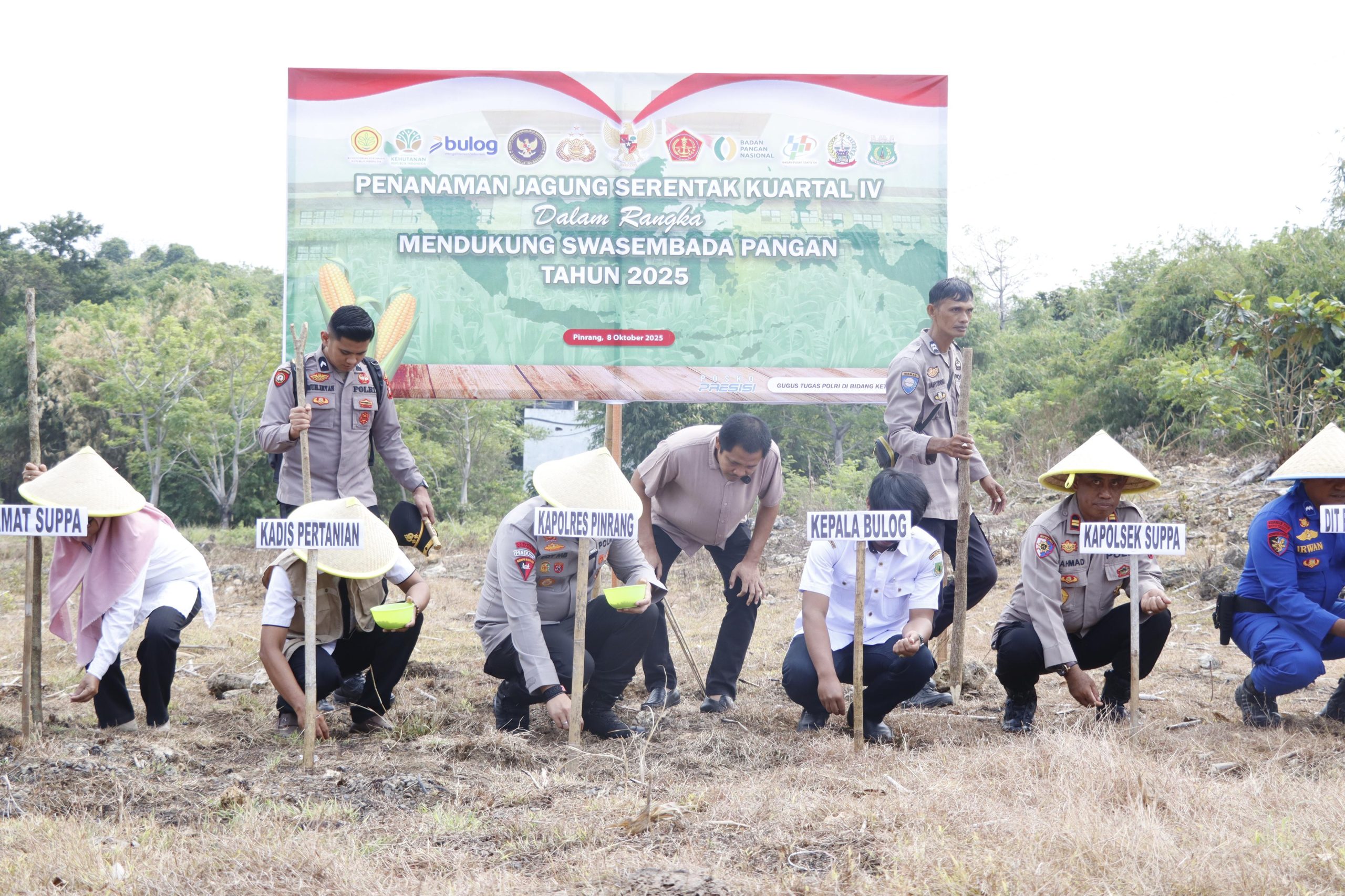 Penanaman jagung dilakukan secara simbolis oleh Kapolres Pinrang bersama unsur Forkopimca Suppa, pejabat utama Polres Pinrang, perwakilan Bulog Pinrang, Camat Suppa, Danramil Suppa, serta para kepala desa, kelompok tani, dan pengurus Bhayangkari Cabang Pinrang. Kegiatan tersebut disambut antusias oleh masyarakat dan kelompok tani setempat.
