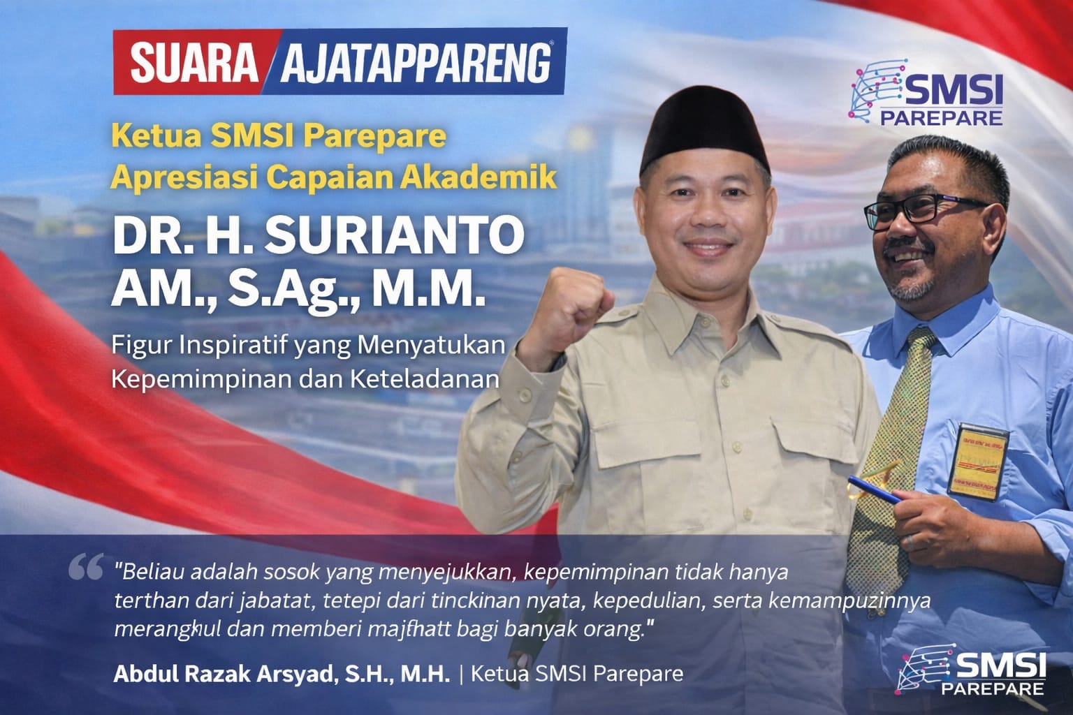 PAREPARE, VOICESULSEL — Ketua Serikat Media Siber Indonesia (SMSI) Kota Parepare, Abdul Razak Arsyad, S.H., M.H., menyampaikan apresiasi mendalam atas capaian akademik H. Surianto AM, S.Ag., M.M., yang berhasil meraih gelar Doktor (S3) di Universitas Muslim Indonesia (UMI) Makassar.
