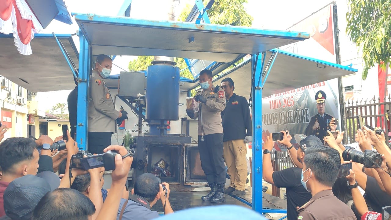 Kegiatan pemusnahan tersebut dipimpin langsung oleh Kapolres Parepare AKBP Indra Waspada Yudha, S.I.K., M.H dan dihadiri oleh unsur Forkopimda, Kejaksaan, Pengadilan, BNN, serta instansi terkait lainnya.