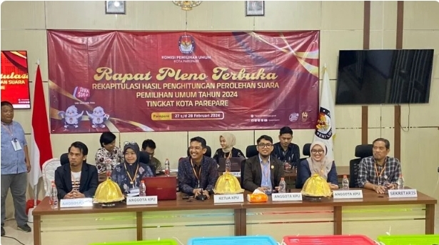 PAREPARE, VOICESULSEL – Komisi Pemilihan Umum (KPU) Kota Parepare menggelar rapat pleno terbuka rekapitulasi hasil perhitungan perolehan suara pemilu tahun 2024. Kegiatan berlangsung di Kantor KPU Kota Parepare, Selasa, 27 Februari 2024.