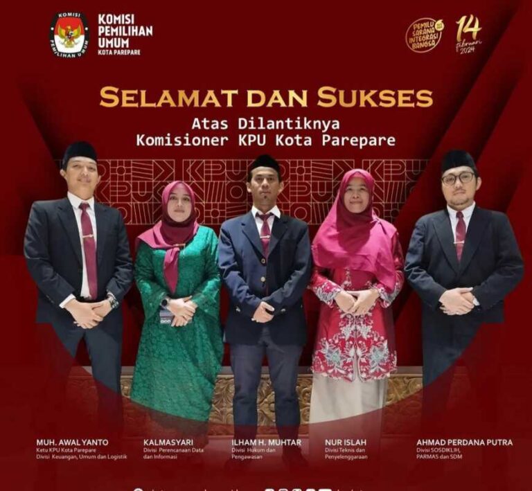 PAREPARE, VOICESULSEL — Lma komisioner Komisi Pemilihan Umum (KPUD) Kota Parepare periode 2023-2028 resmi dilantik yang berlangsung di Aula Utama Gedung KPU RI Kota Makassar, Sabtu, 30 Desember 2023.