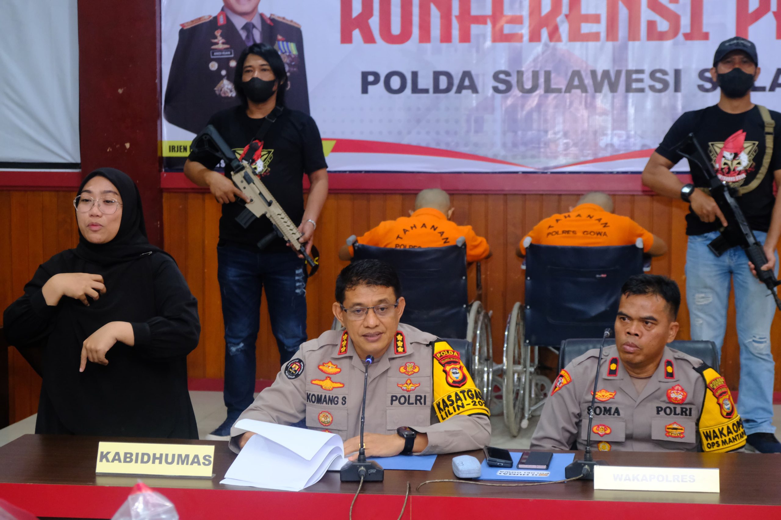 Kabidhumas Polda Sulsel Kombes Pol Komang Suartana didampingi Wakapolres Gowa dan Kasat Reskrim Saat menggelar Press Release di Mapolres Gowa , Rabu, (27/12) mengatakan 2 Pelaku berhasil ditangkap yakni HN (27) warga Klapanunggal Kab.Bogor dan AS (45) warga Cilodong Kota Depok, sementara 2 lainnnya berstatus DPO, yaitu Perempuan PS dan RA.