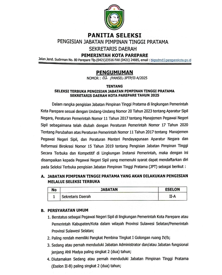PAREPARE, VOICESULSEL – Pemerintah Kota Parepare resmi mengumumkan Seleksi Terbuka Jabatan Pimpinan Tinggi Pratama untuk posisi Sekretaris Daerah (Sekda) Kota Parepare.