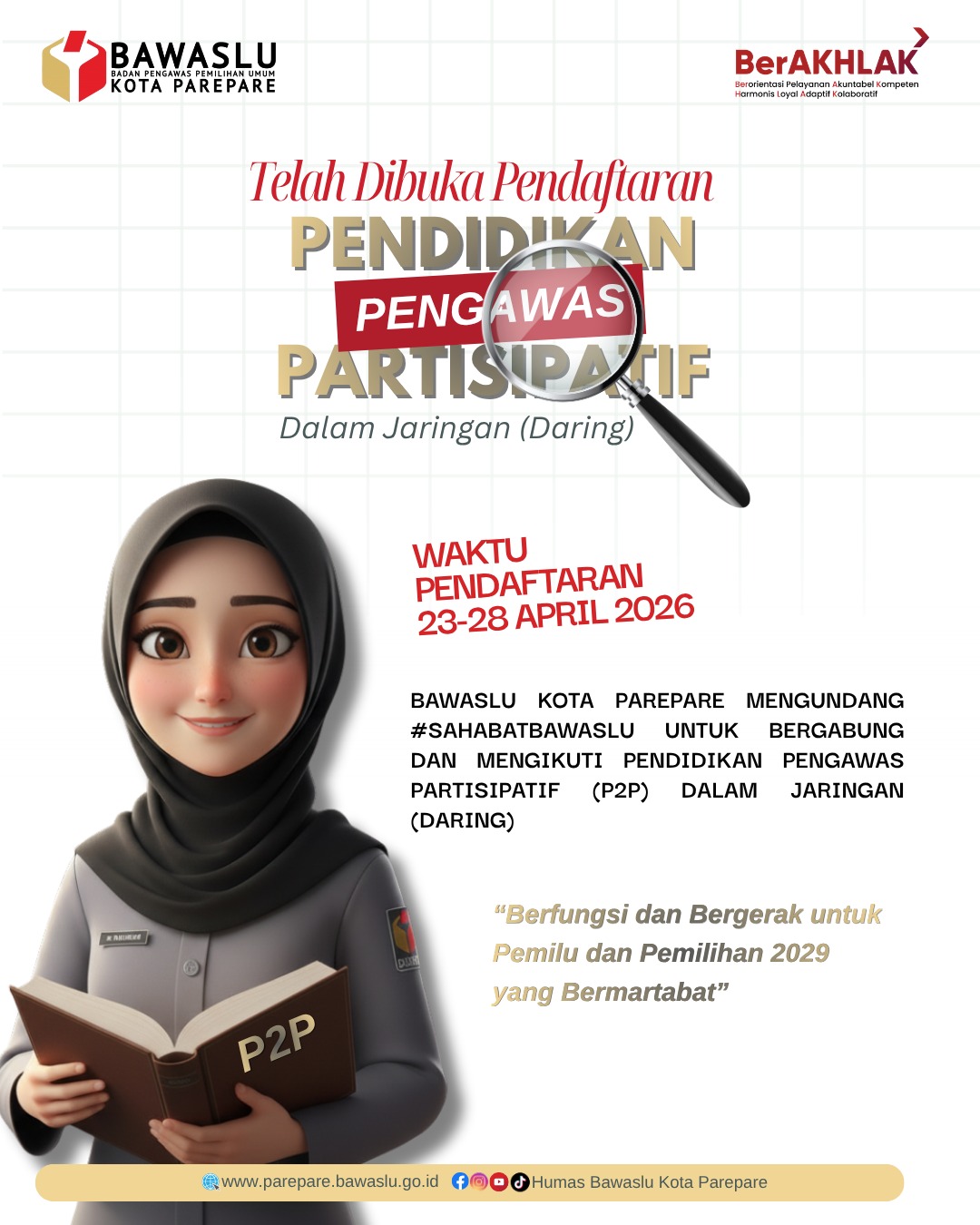 Parepare — Bawaslu Kota Parepare secara resmi membuka pendaftaran Pendidikan Pengawas Partisipatif (P2P) Tahun 2026 yang dilaksanakan secara daring. Program ini merupakan salah satu upaya strategis Bawaslu dalam meningkatkan partisipasi masyarakat dalam pengawasan Pemilu dan Pemilihan.