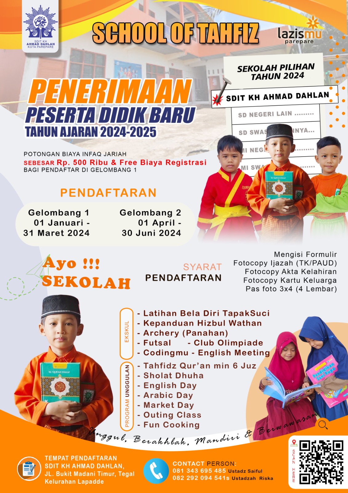 PAREPARE VOICESULSEL — School of Tahfidz (Sekolah Penghafal Al Qur’an) SDIT KH Ahmad Dahlan Kota Parepare menyambut tahun pelajaran baru 2023/2024 telah membuka Pendaftaran Peserta Didik Baru (PPDB).