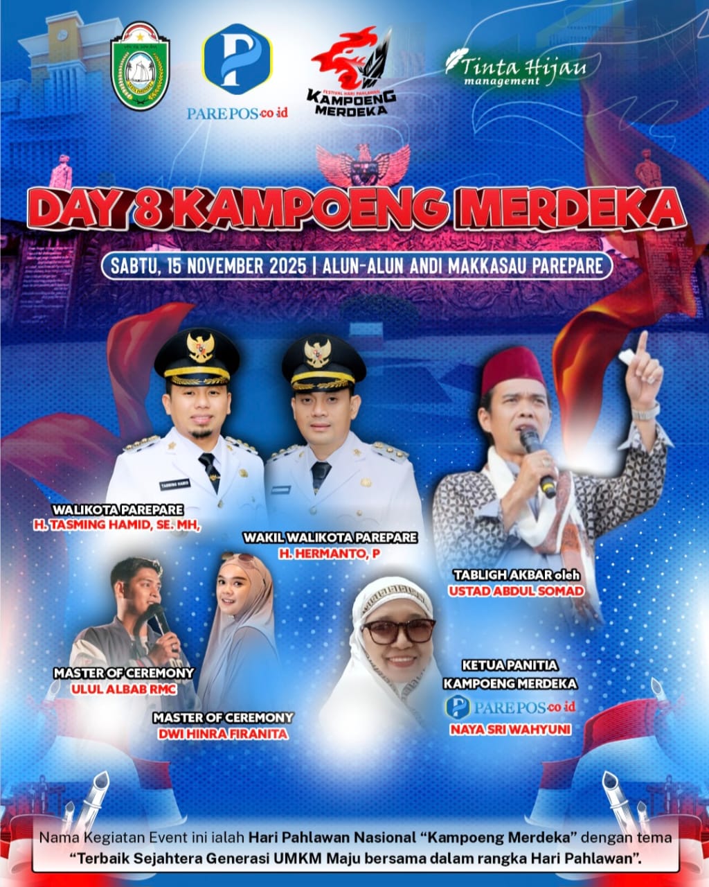 “Tabligh Akbar menghadirkan Ustadz Abdul Somad di kegiatan Kampoeng Merdeka yang dilaksanakan oleh event organizer Parepos.co.id bekerjasama dengan Pemerintah Kota Parepare pada Sabtu, 15 November, tepatnya ba’da Isya,” jelasnya.