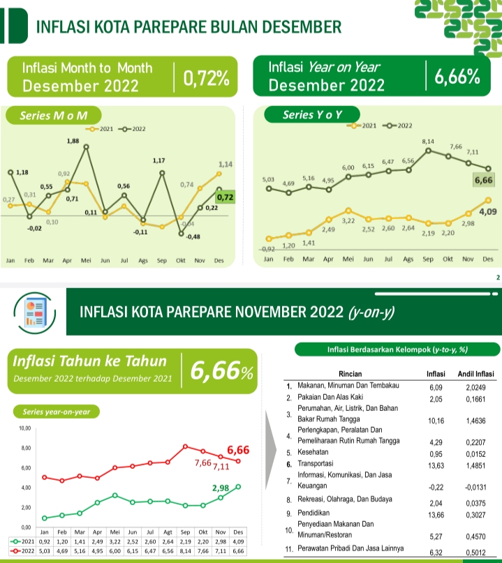 VOICE SULSEL — BPS Parepare mencatat Inflasi kota Parepare mencapai 6,66 persen tahun 2022. Angka ini naik dari tahun 2021 lalu sebesar 4,09 persen. Sesuai data yang diterima dari BPS Parepare, inflasi Parepare tahun ini meningkat karena adanya harga beberapa komoditas yang naik yang menjadi penyumbang inflasi seperti tarif air PAM, bahan bakar minyak, biaya masuk sekolah atau perguruan tinggi serta makanan pokok.
