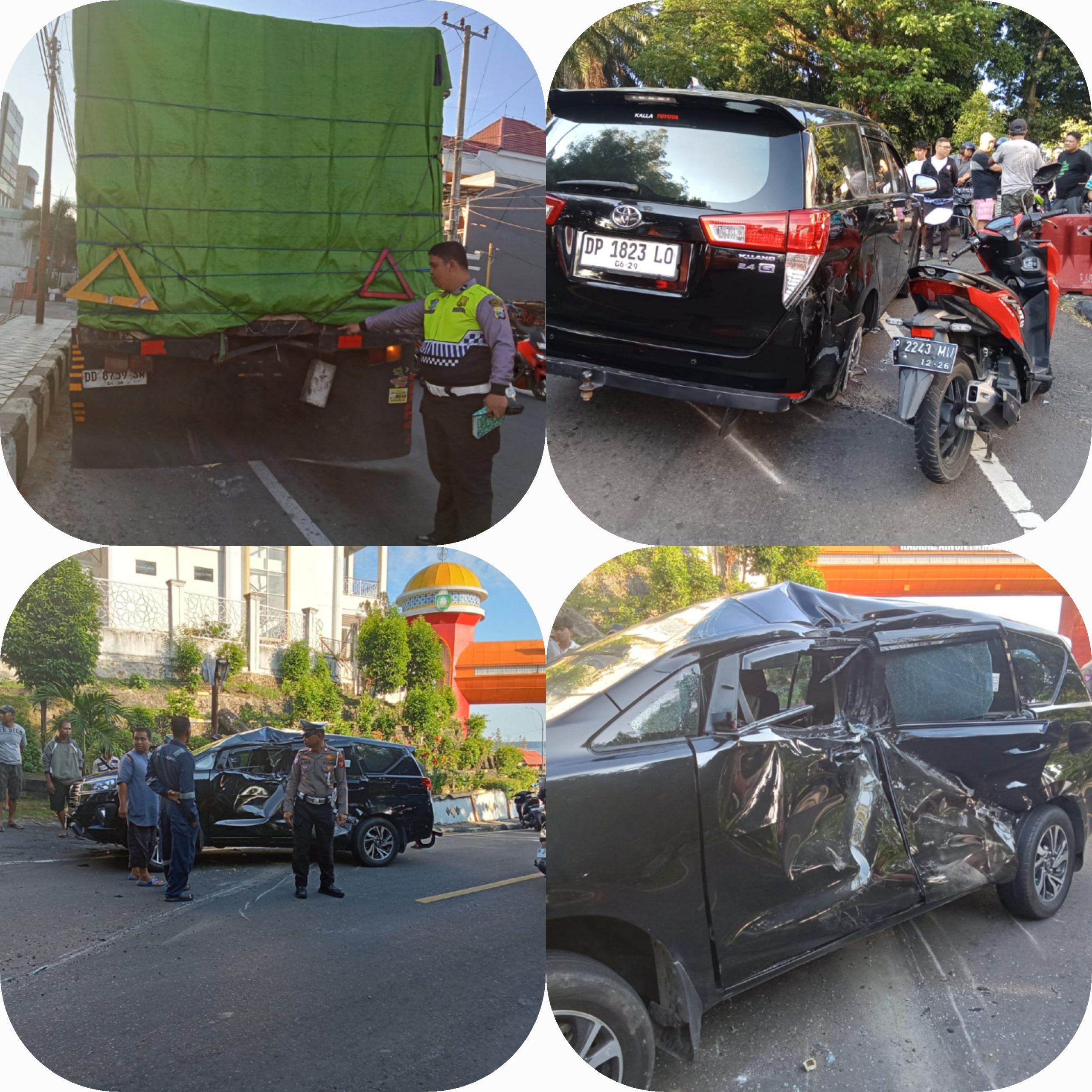 Tak hanya itu, satu unit sepeda motor yang berada tepat di samping mobil Innova juga ikut tertimpa bodi mobil yang terdorong akibat benturan.