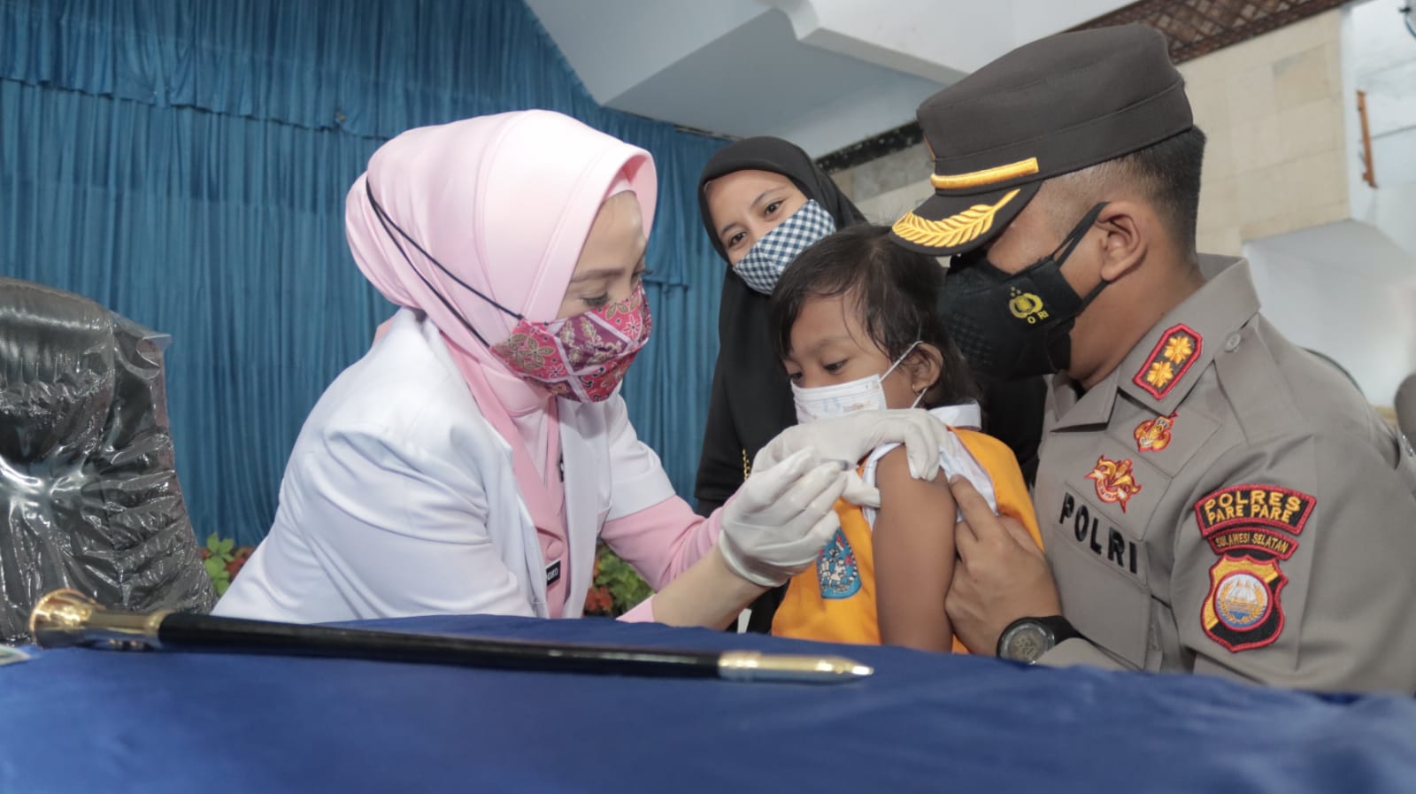 PAREPARE, voicesulsel.com – Antusias anak mengikuti vaksinasi usia 6-11 tahun di Gedung Baruga Pratista Polres Parepare, Sulawesi Selatan, mendapat apresiasi dari Ketua Bhayangkari Parepare, dr. Lioni Andiko, yang juga Istri Kapolres Parepare, Sulawesi Selatan.