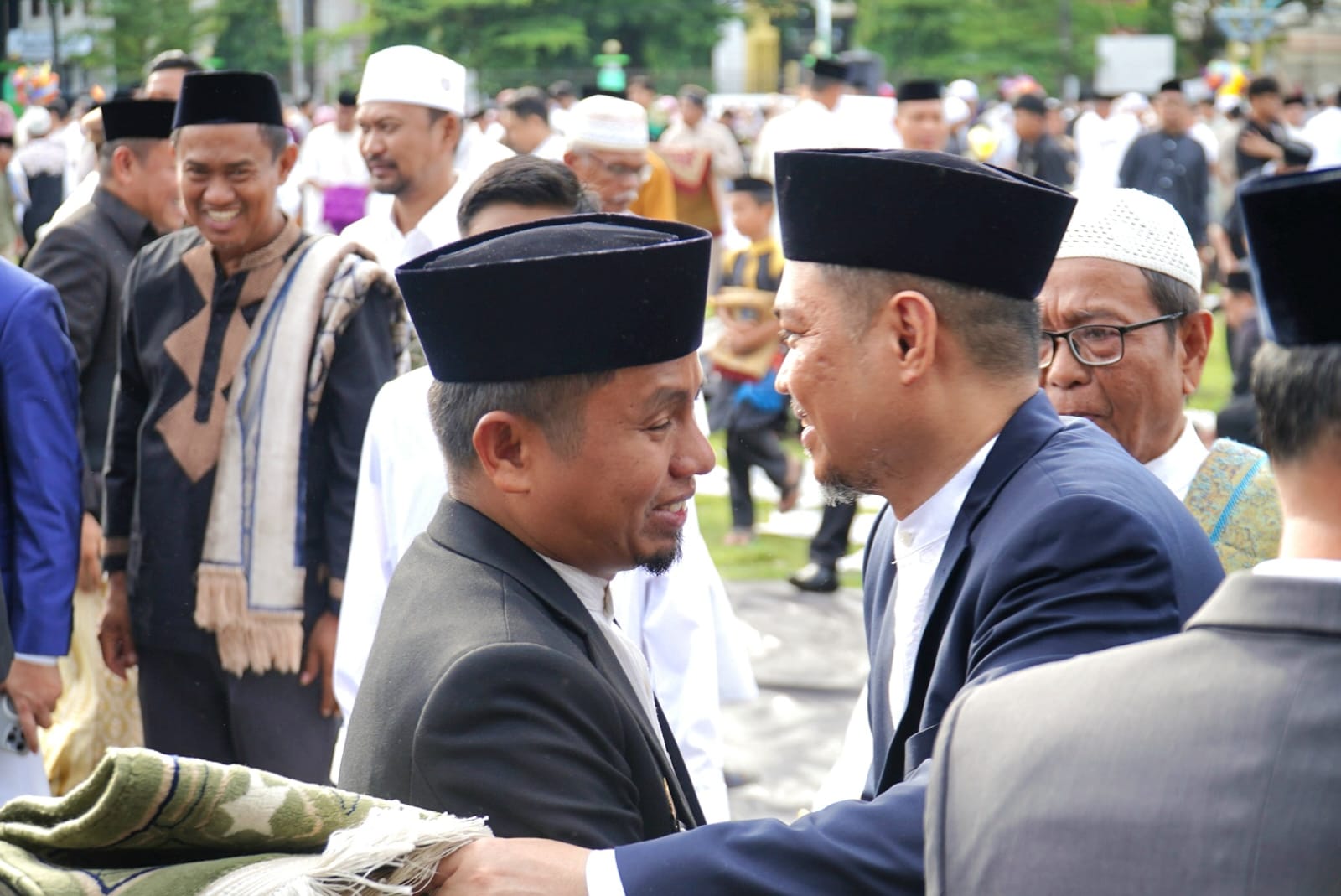 Usai pelaksanaan salat, Wali Kota Tasming Hamid menyerahkan seekor sapi kurban bantuan dari Presiden Republik Indonesia, Prabowo Subianto.