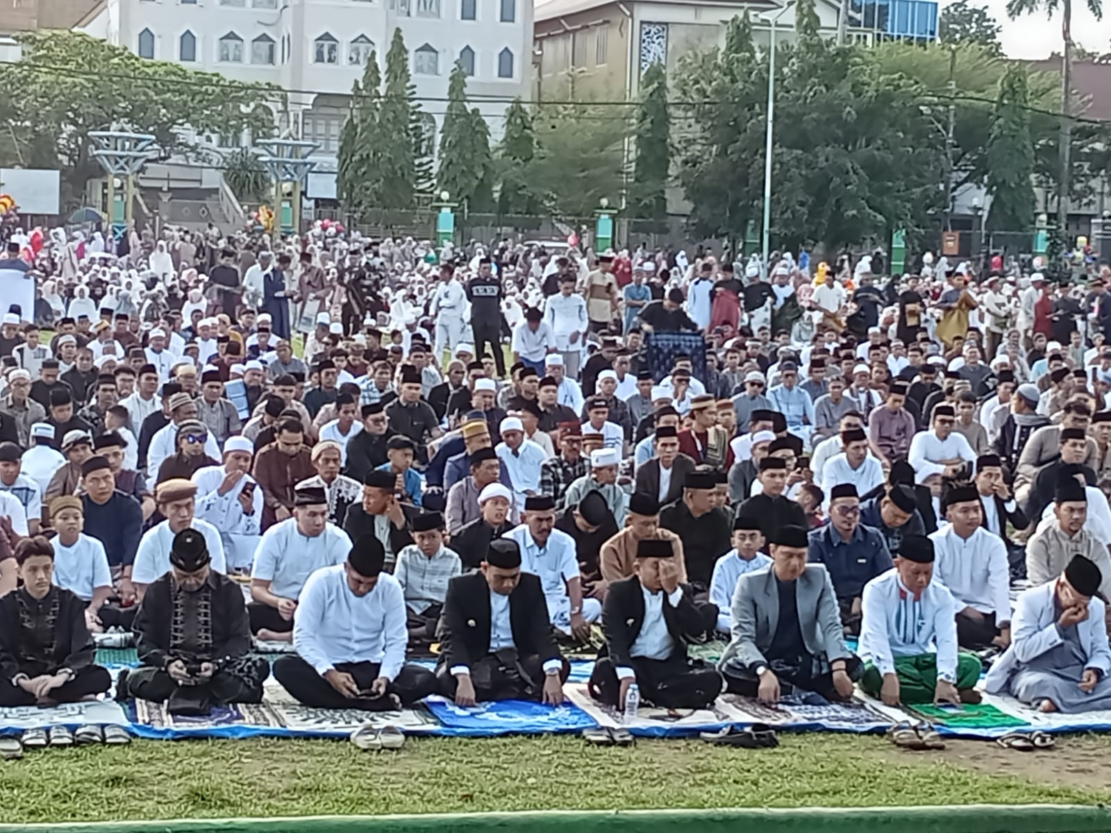 “Hari ini adalah hari yang istimewa. Kita berkumpul dalam kebersamaan untuk melaksanakan Shalat Idul Fitri sebagai wujud rasa syukur atas nikmat dan berkah Allah. Ini saatnya kita merayakan kemenangan dengan penuh sukacita, saling memaafkan, dan mempererat ukhuwah,” ucapnya.