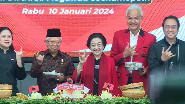 Usai prosesi potong tumpeng tersebut, Megawati bersama Ma’ruf, Ganjar, elite PDIP, dan pimpinan partai politik pengusung pasangan calon nomor urut 3 melakukan foto bersama. Semuanya melakukan pose tiga jari metal dalam proses tersebut, termasuk Ma’ruf.