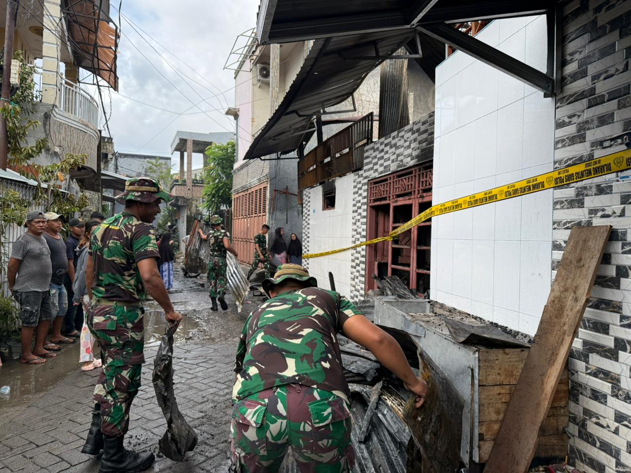 Dipimpin Lettu Czi Fattah Ilham Rahmatullah, S.Tr.(Han), para prajurit langsung mengevakuasi barang milik warga serta membersihkan puing-puing bangunan yang hangus terbakar.